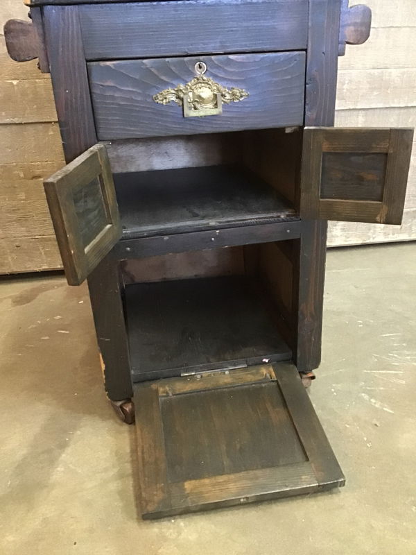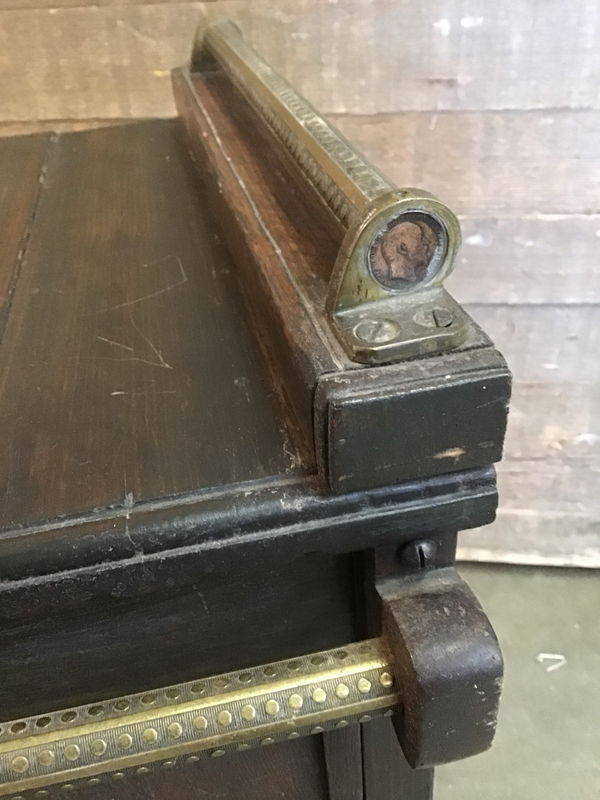 Super cool and very old little rolling table with stunning brass rods and little cubbies for storage. This looks to be made with a mix of woods, all stained a dark color. The three brass rods have a dotted pattern and the top one has antique coins pressed into the side. The little drawer has an ornate brass plate as well. The two door section is missing its little astragal piece that covers the seams when closed. The bottom door hinges from the bottom. The overall box is in good shape, though there is some wear to the thin panels on the sides and back. There is also a natural crack in the top that could be fixed with some wood glue and clamps. Not sure of it's original functionality, but this would be a great little statement piece.