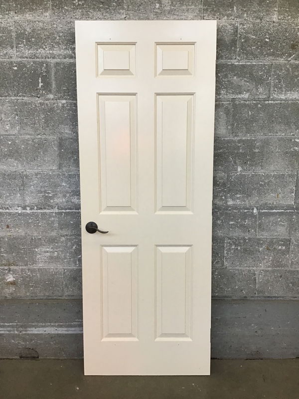 Hollow core interior door with six faux panels and oiled bronze hardware.