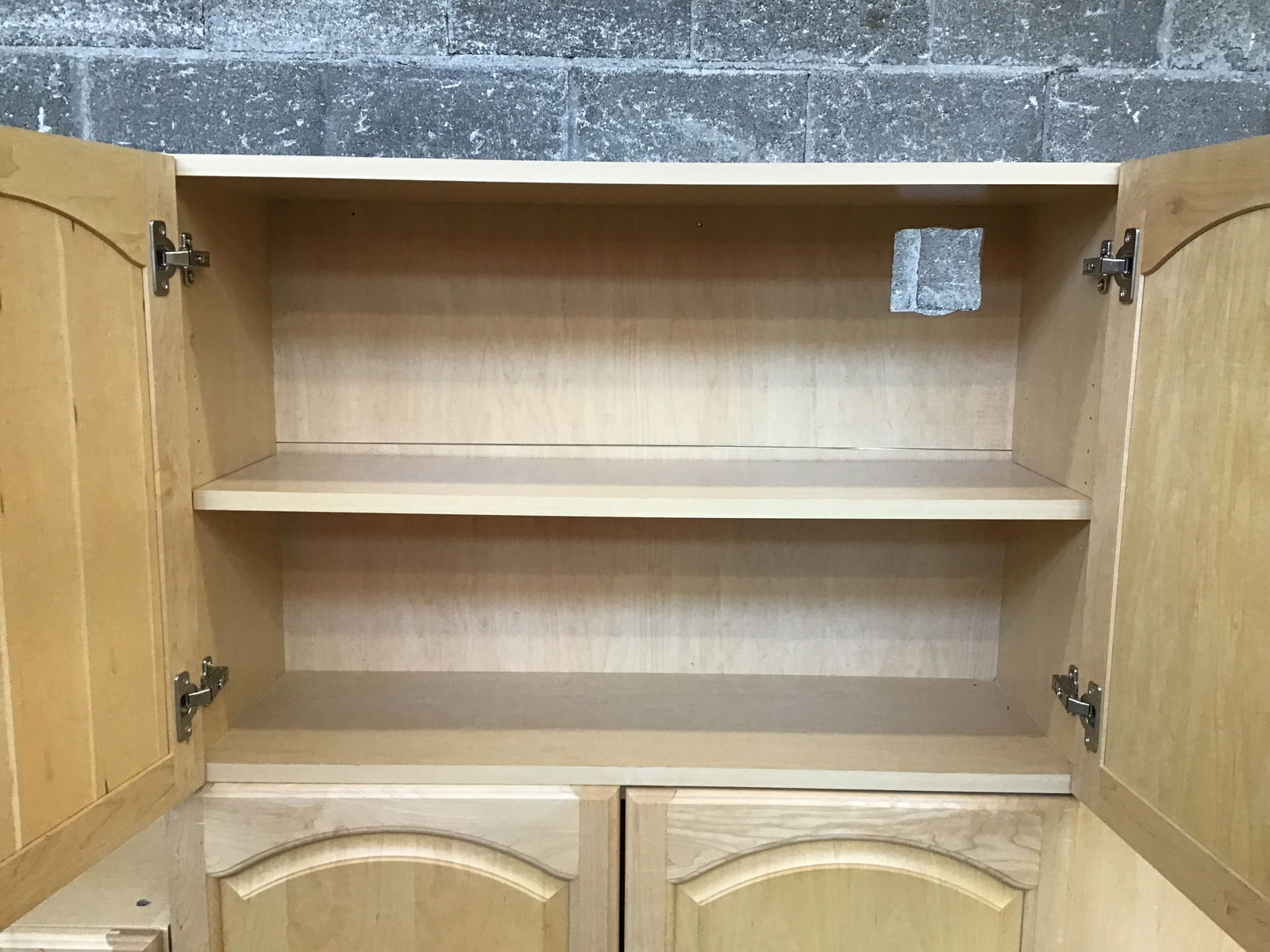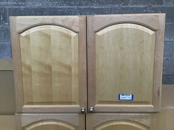 Clear finished alder upper cabinet with arched, raised panel doors and adjustable shelving. Check out other items on this job for more matching cabinets!