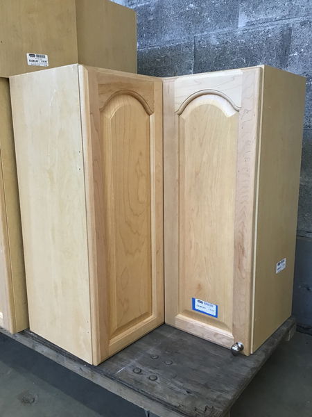 Clear finished alder corner upper cabinet with arched, raised panel doors and adjustable shelving. Check out other items on this job for more matching cabinets!