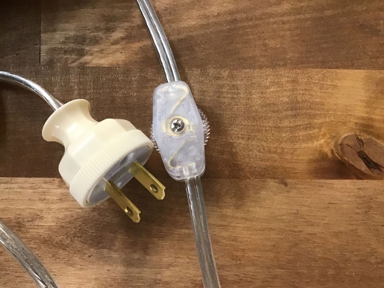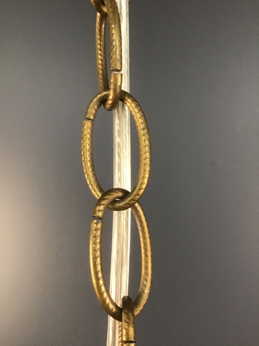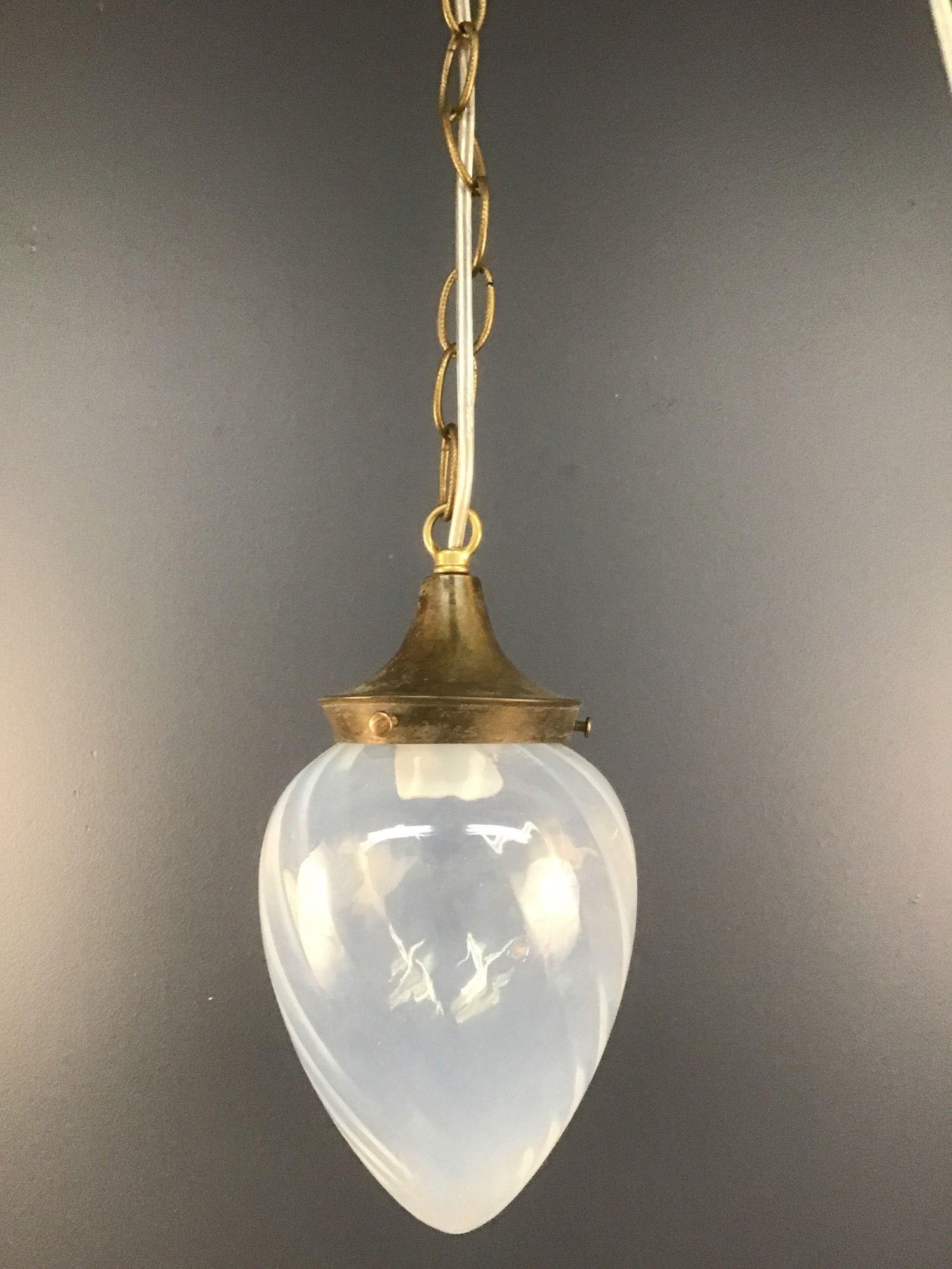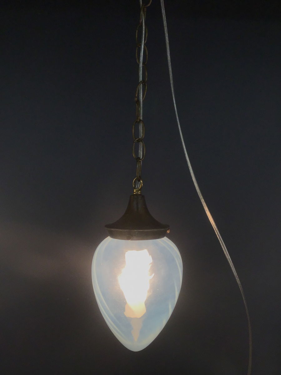 These unique opaline glass bullet shape shades have been paired with brass fitters and can be used as a plug-in swag light. Originally, the shade was most likely part of a larger, 3-5 arm chandelier fixture. The shade is 5" diameter by 7" tall, and the overall height with the lighting chain is 31".