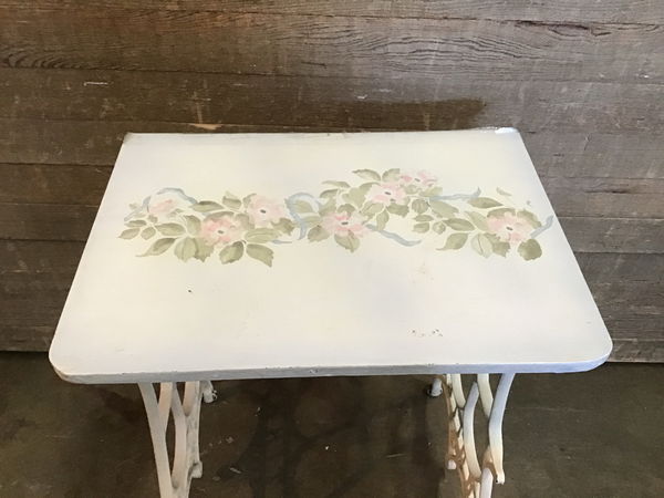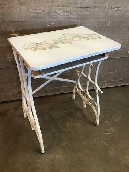 Cute little vintage table that was made with a converted cast iron White sewing machine base. The top has a hand painted floral motif on it and they've attached a lower shelf for material storage. This is on one way wheels. This is a super cute piece that would work well in a small space or craft room.