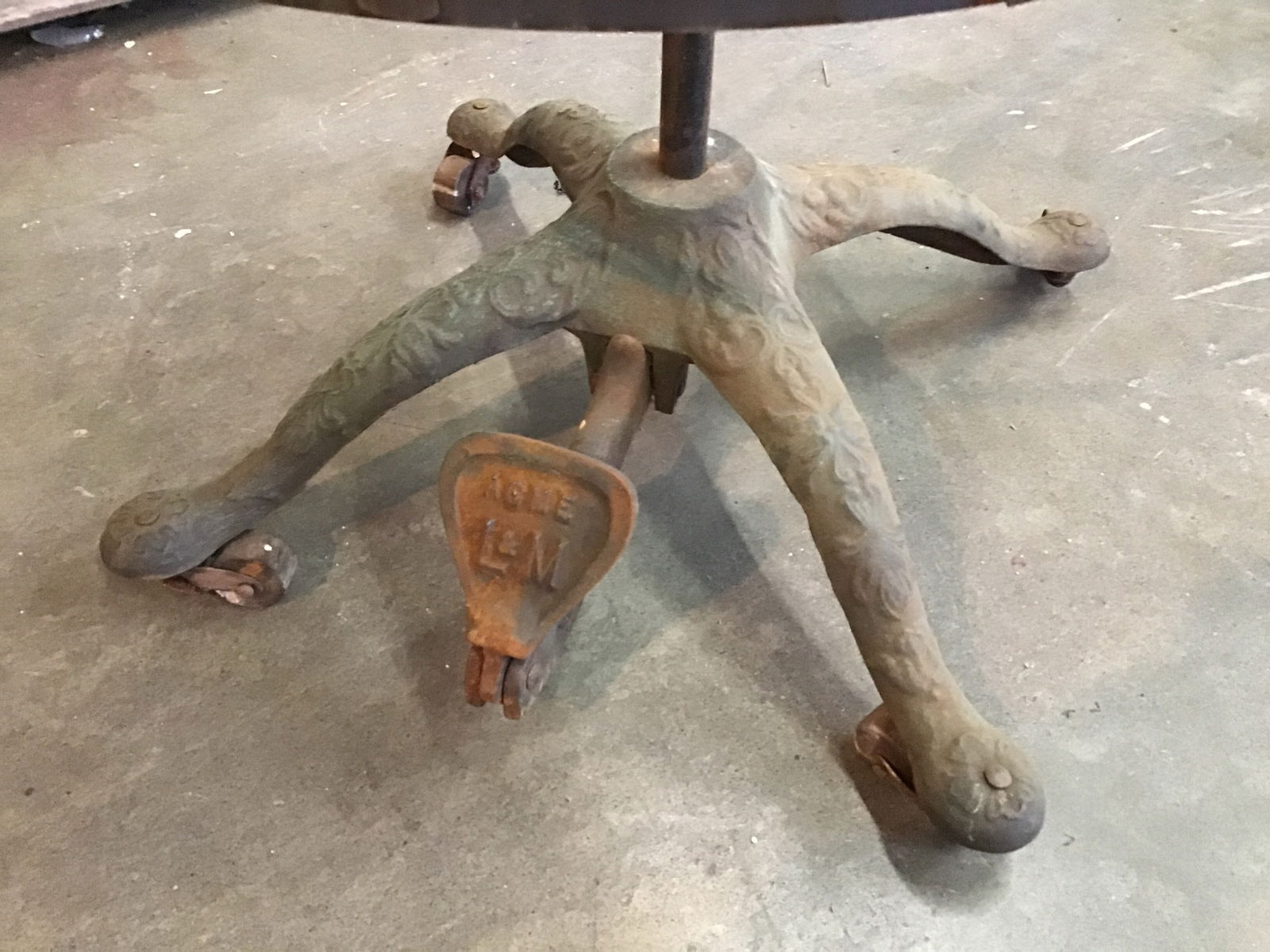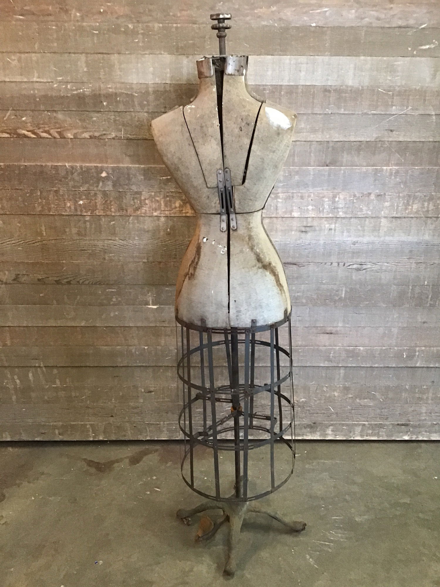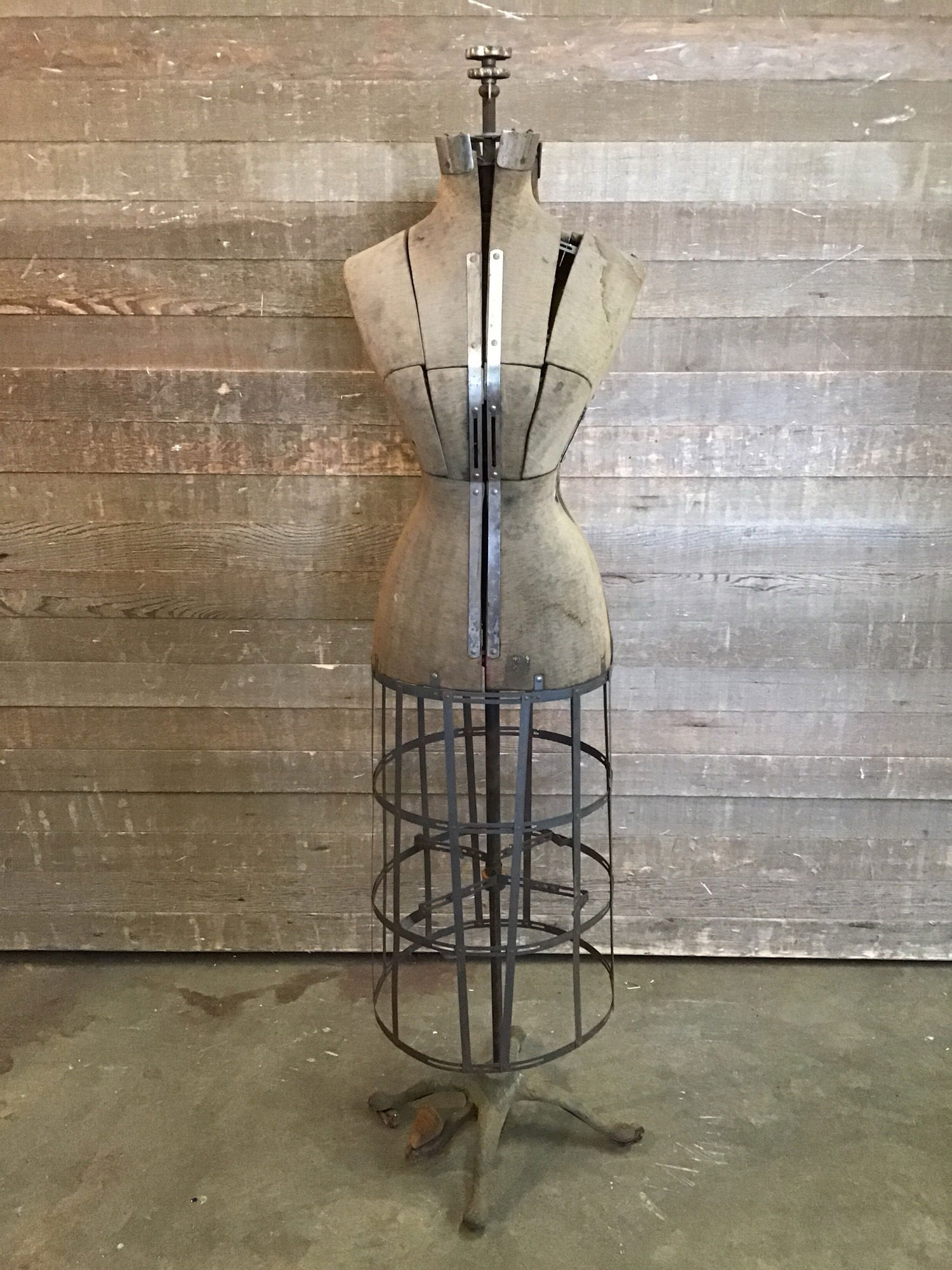 Antique adjustable dress form by ACME L&M. This beauty has been around the block a bit, but still looks to be in decent condition. The fabric cover is dirty/stained, but the only tears on the edge of the shoulders. The panels are adjustable so you can vary the size as needed and this includes the extended wire skirt. It comes on a cast iron stand with ornate decorations and wooden wheels. It may need some WD40 in some spots and new wheels if used as a functional dress form. Overall great condition for it's age and would be great for any seamstress or aspiring clothes maker.