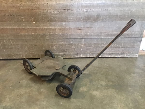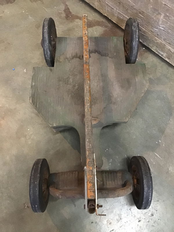 Pretty cool old cart with a handle, not positive, but my guess is a kid could sit on it and be pulled around. The front looks to have a spot to rest feet. Wheels are solid and turn great, though it doesn't handle sharp turns well. The base is plywood, and the handle is wood with some number markings along it.
