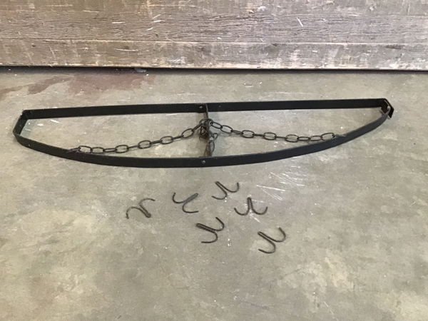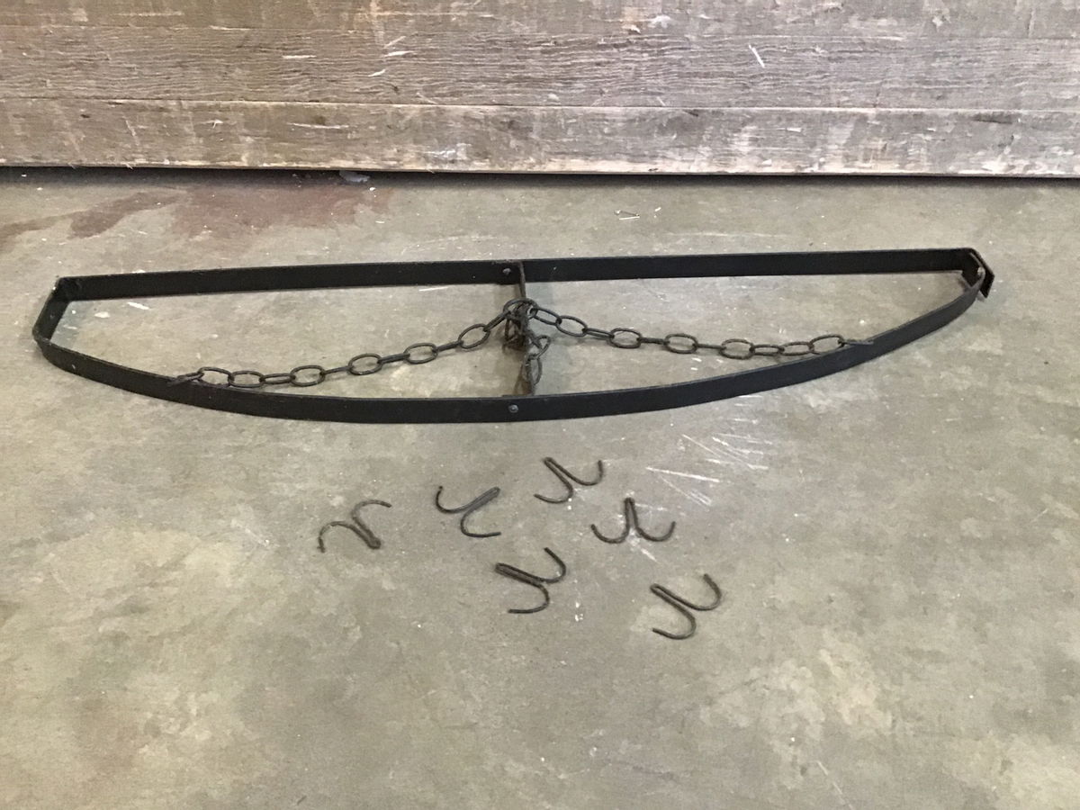 Little hanging pot rack with some hooks. Hangs from three chains collected in the center and extra mounting holes on the sides. One side is separated from the other but will be secured once installed. Covered in kitchen grease and will need a deep clean before use.