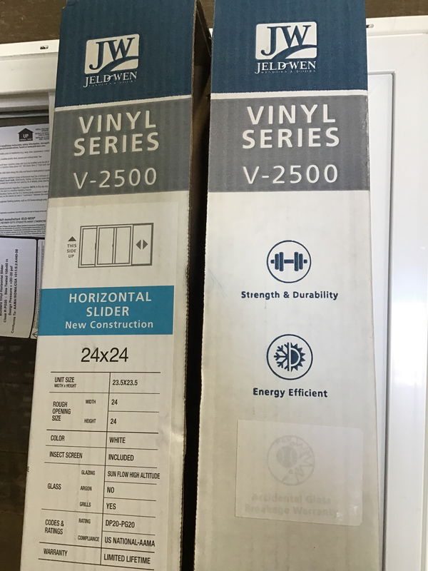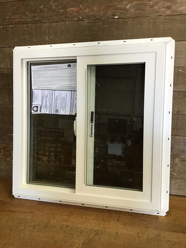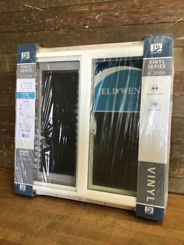 Brand new, never installed Jeld Wen vinyl slider. 2' x 2'. The window is a horizontal slider with clear thermopane glass.