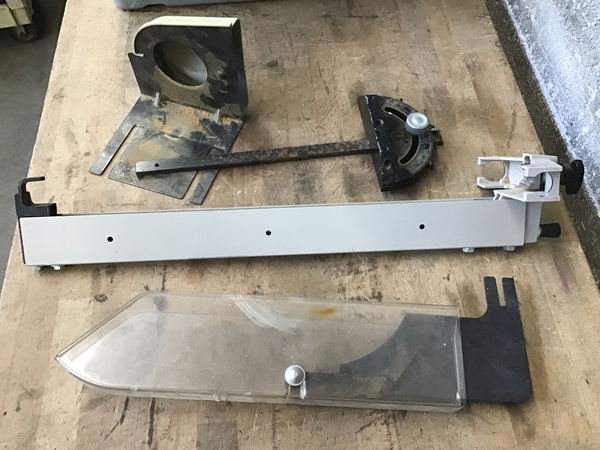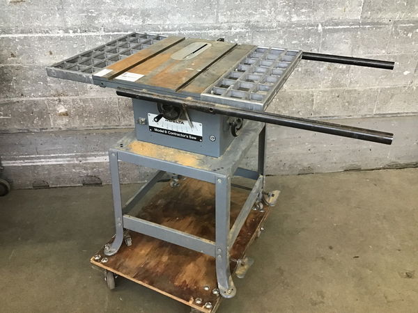 Delta-Rockwell model 9 contractor saw circa 1985. Ran like a dream when we tested it out, but as always - use at your own risk!! Mounted on a great steel stand with retractable casters Comes with a motor cover, adjustable guide, miter gauge, and anti-kickback blade guard splitter (the blade guards alone sell on ebay for over $100). Has a 9 in blade and throat plate installed, but you can easily swap those out. The table surface has a bit of rust but otherwise this little darlin' is looking fantastic!