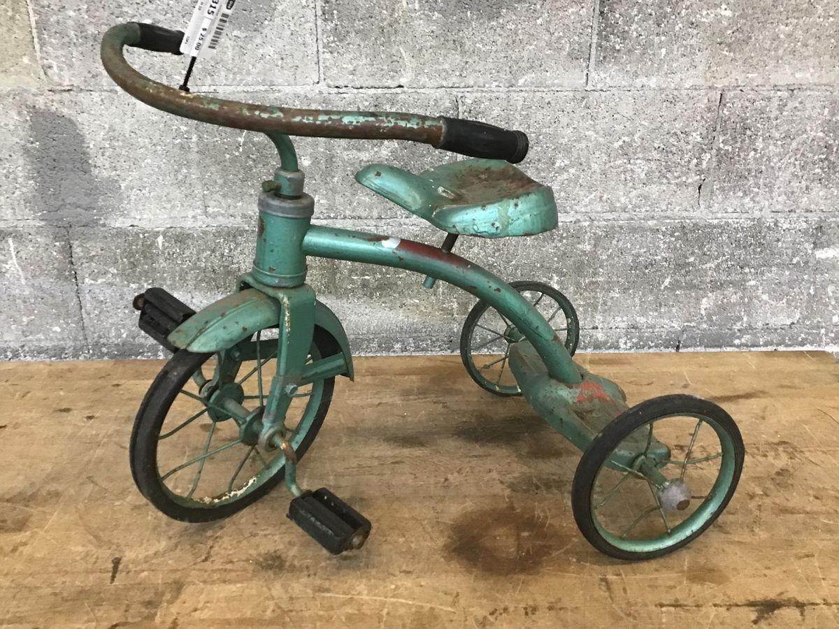 This is an old vintage tricycle with a quite patinated green paint job.