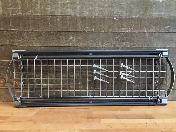 Small steel hanging pot rack. Hangs through chain link. Comes with sliding hooks.