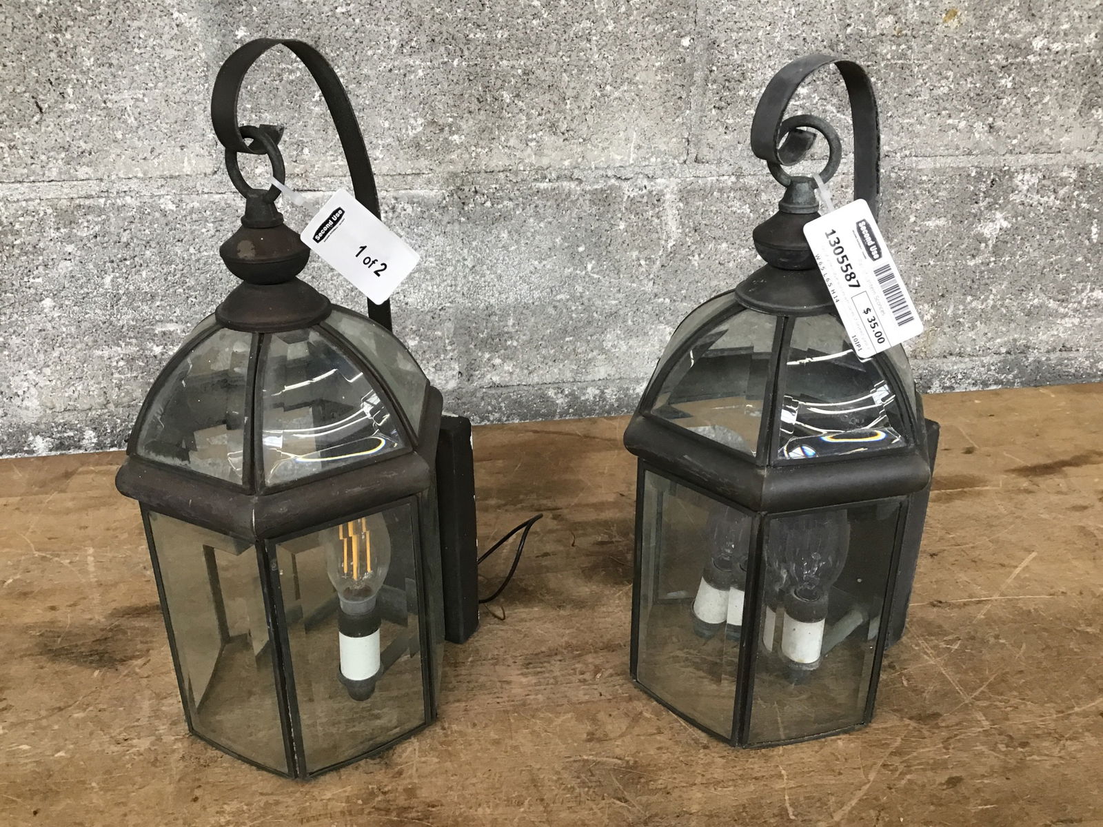 Pair of lantern-style sconces with panes of beveled glass and a curved faux hanger on top for detail.