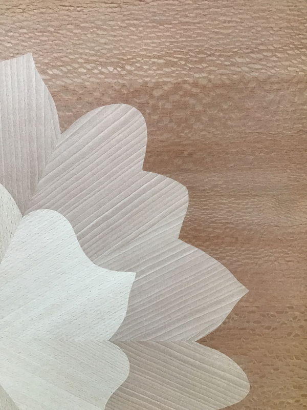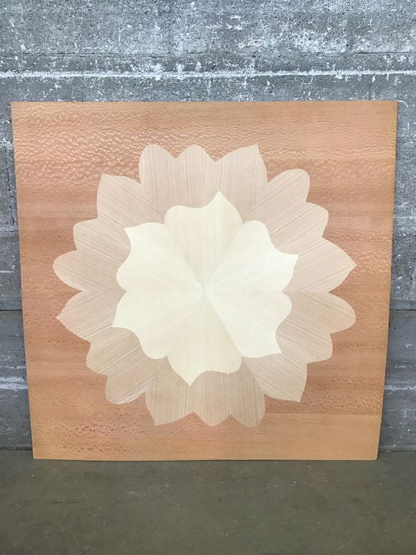 A large wooden panel with an intricate verneer design crafted into the surface. This would make for a unique table top/addition to an existing table top to add a strong sense of craftsmanship and allure to your furniture.