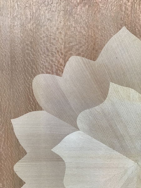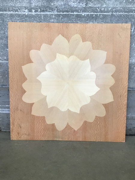 A large wooden panel with an intricate verneer design crafted into the surface. This would make for a unique table top/addition to an existing table top to add a strong sense of craftsmanship and allure to your furniture.