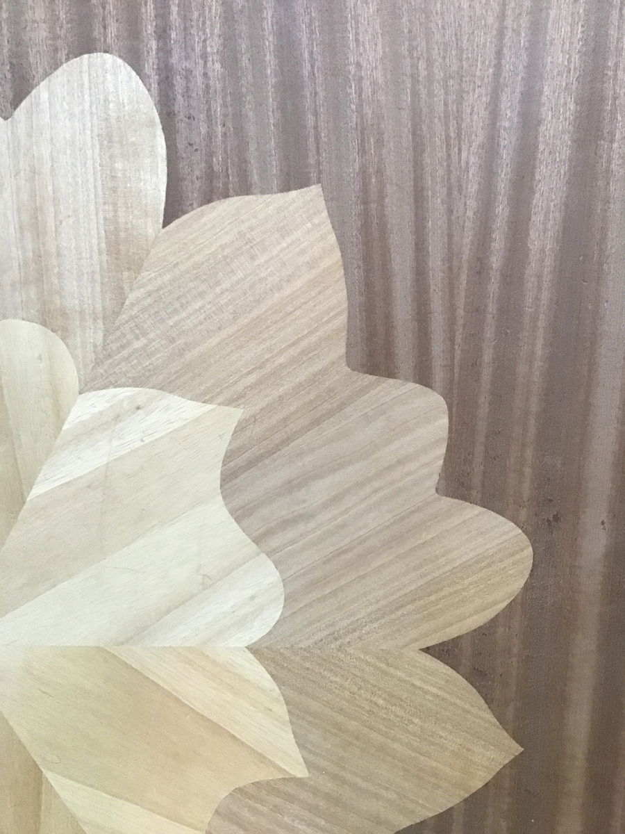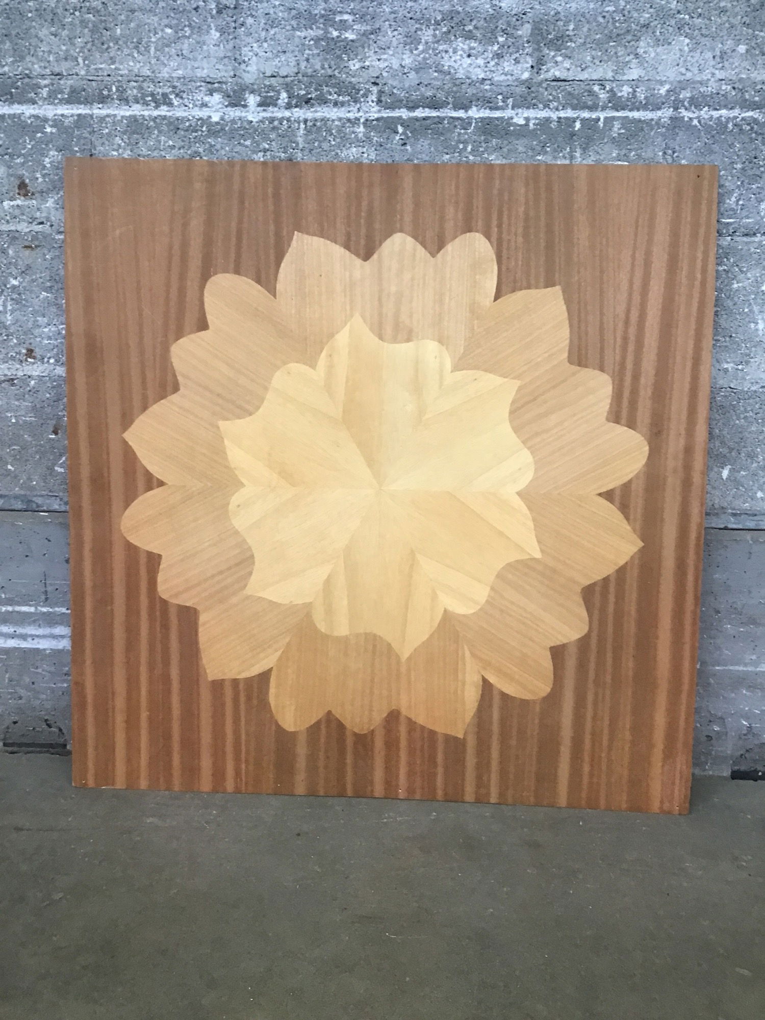 A large wooden panel with an intricate verneer design crafted into the surface. This would make for a unique table top/addition to an existing table top to add a strong sense of craftsmanship and allure to your furniture.