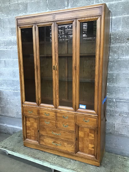 This display cabinet from Stanley Furniture just oozes understated cool! Its solid brass flush-set drawer pulls are reminiscent of antique campaign-style chests, while the clean lines and natural finish are the perfect end-cap to the Mid-Century modern period. We can't get over the sweet checkerboard patterned doors on the lower cabinets - they're like a little taste of the funkiness that was to come in the later 70s and 80s! The overall finish is a medium-toned oak veneer with flyspeck detail and in fantastic shape overall. The drawers are solid wood with dovetail joints, and include one felted base and cover for protecting true silverware/silverplate (removable if desired). The two lower cabinets each have an adjustable shelf, and the large upper cabinet has two fixed position glass shelves (one has a large chip on a corner, price reflects) as well as a built-in light to show off your treasures!