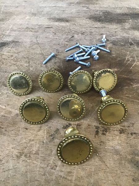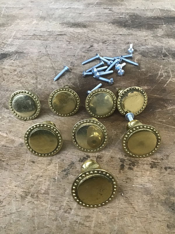 Just what the title says: 8 pack of brass cabinet pulls. 1.25" diameter. Screws included.