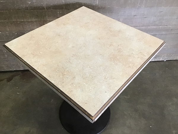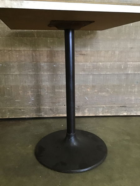 Nice cafe table with a round cast iron base picked up from a local brewery. Top is faux stone with a strip of Oak. In good used condition. Not a fan of the top? This would be super easy to take off and replace with a table top of your choice. Base diameter is 17" Great for restaurants/cafes or small kitchens! Photo may be representational.