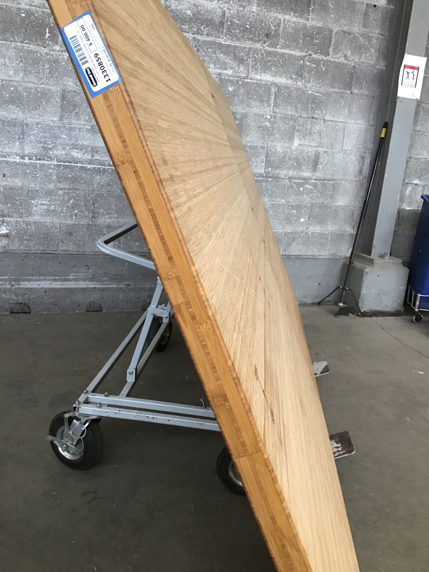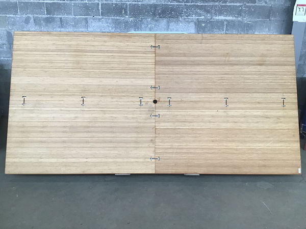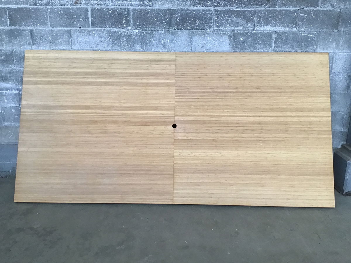 Double thickness, finish grade bamboo ?plywood? that was probably a table top since it has finished edges all around, but could make two countertops if split in half. There is a 1 3/4" center hole. It does have I bolts joining four equal sized (29 3/4" x 59 3/4") quarters together (see photos).