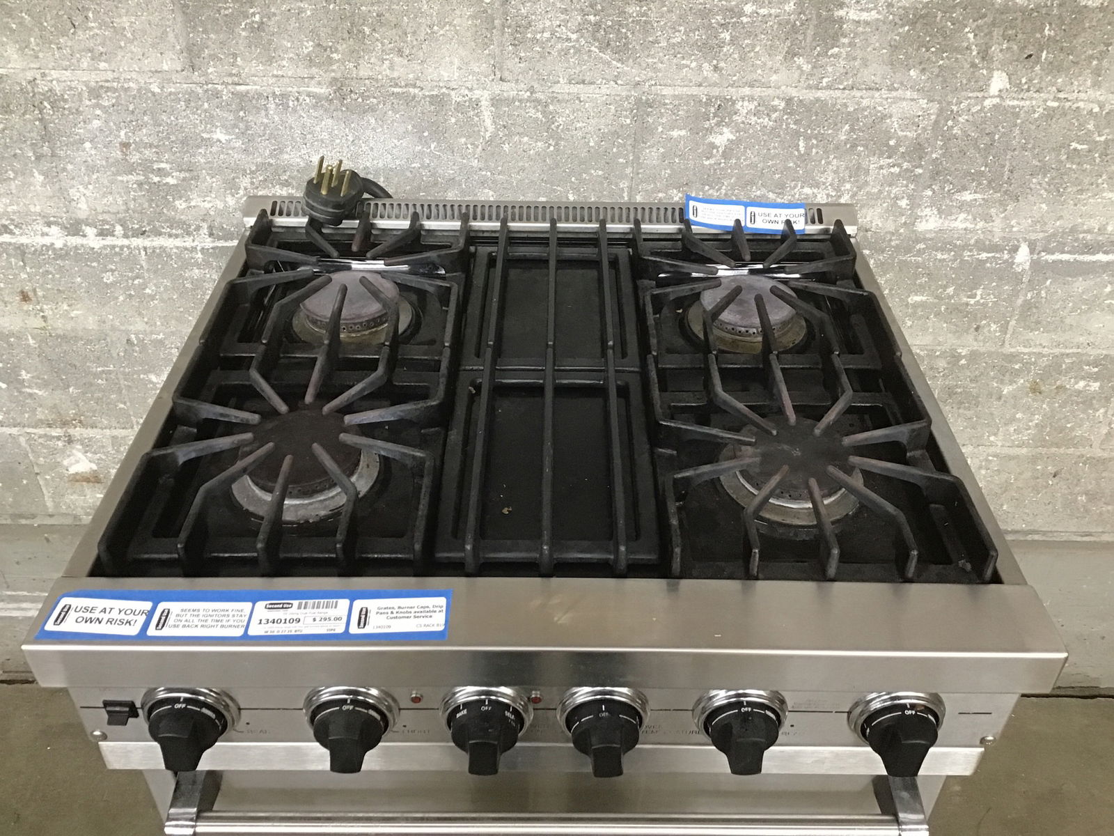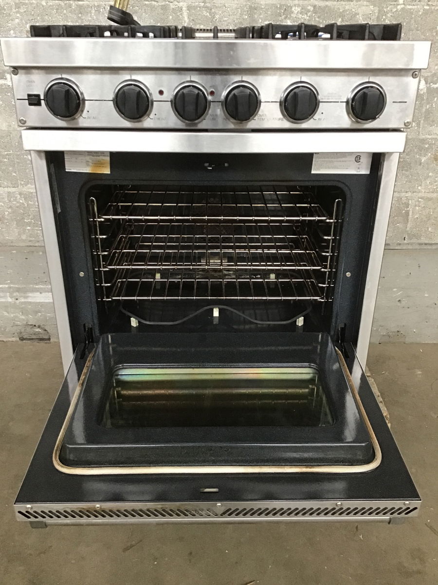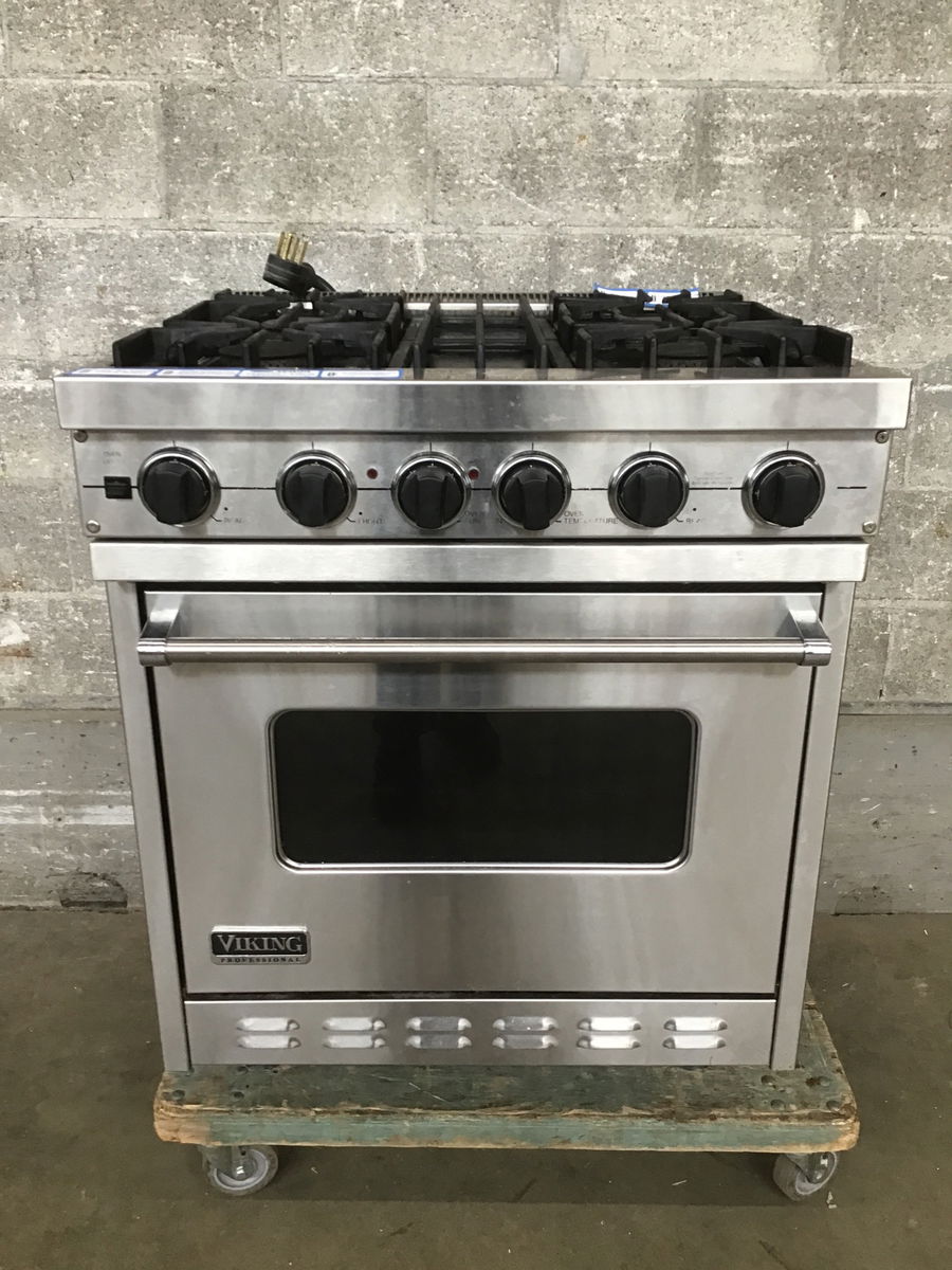 Ca. 2005 Viking range with four gas burners above an electric oven. Looks like it's seen everyday use. Our Salvage Services team tested this on site, and it worked fine, BUT the ignitors stay on when you use the back right burner. Price reflects.
