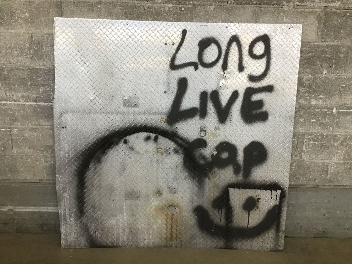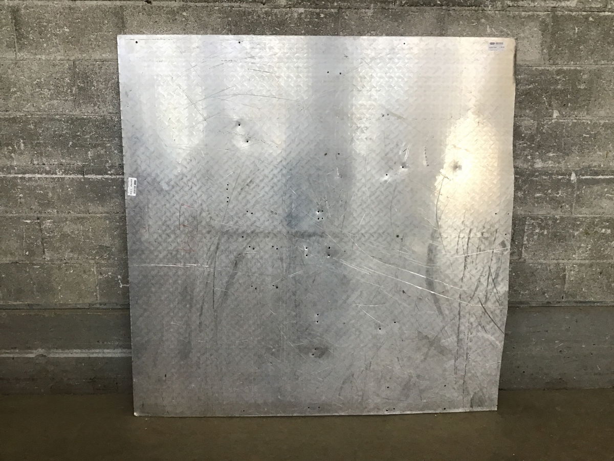 Eighth inch thick aluminum diamond plate with some screw holes,fasteners, graffiti and not straight or square left edge. Price reflects condition.