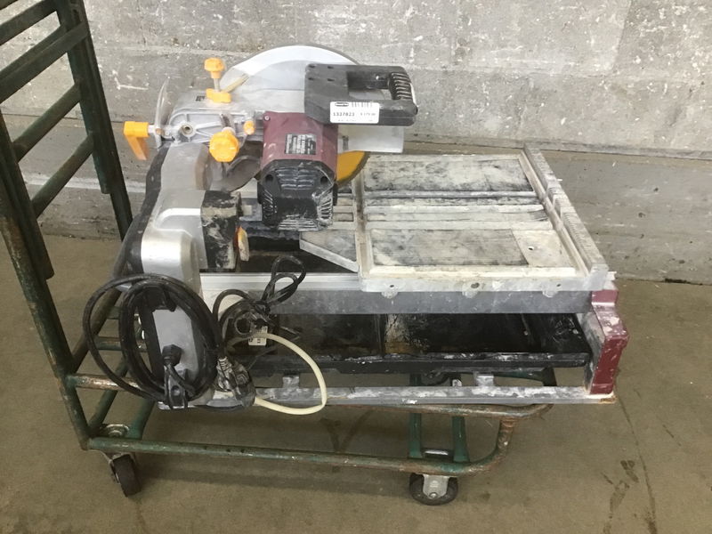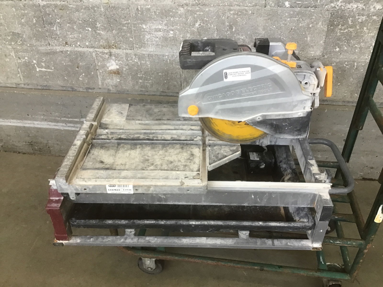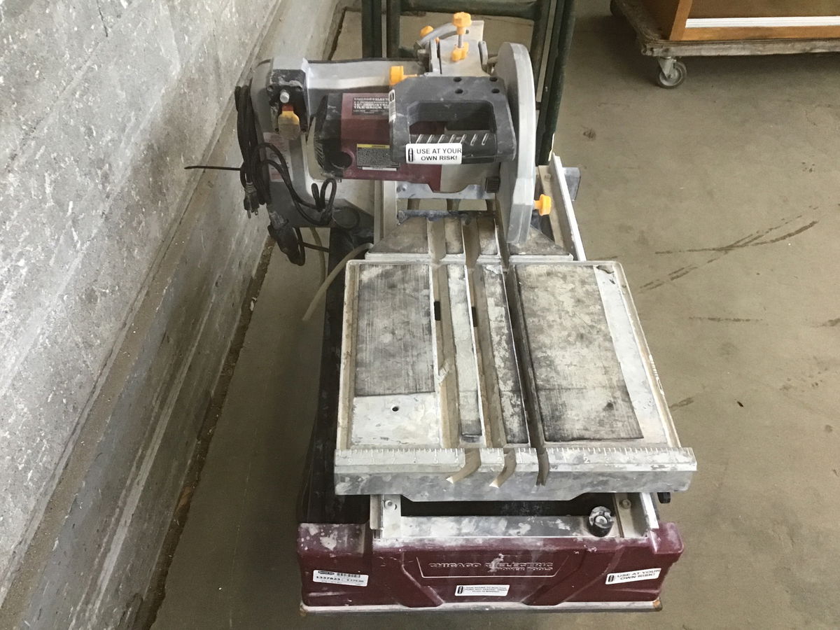 Chicago Electric (from Harbor Freight) 2.5 HP, 10" wet tile saw that seems to run fine. The plug is missing from the reservoir, so we couldn't test the pump, but is sounds fine when the switch was flicked.
