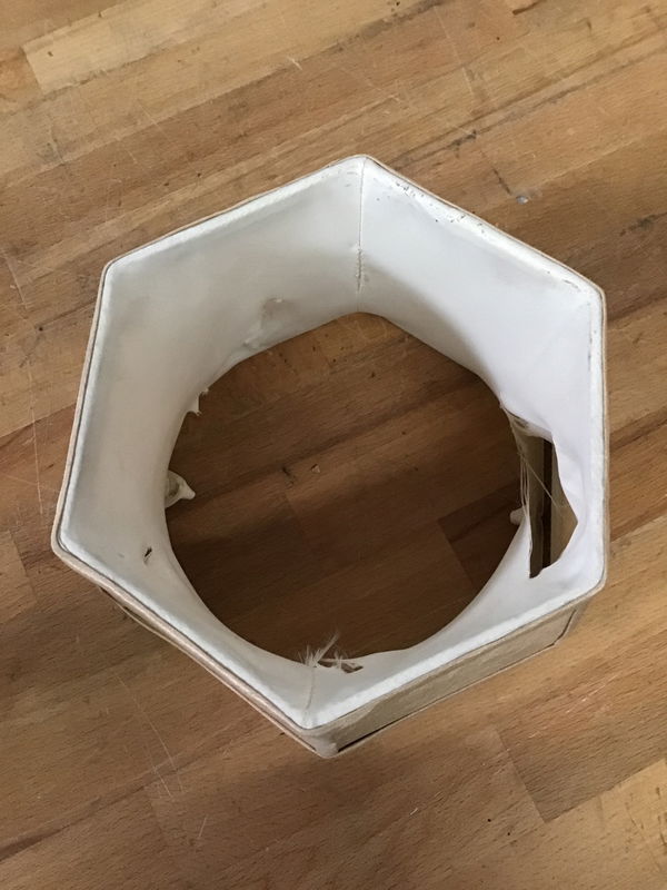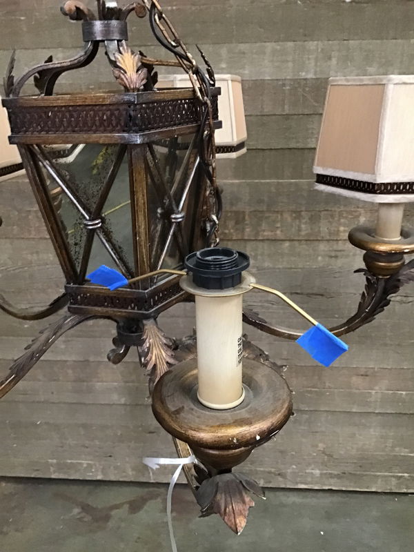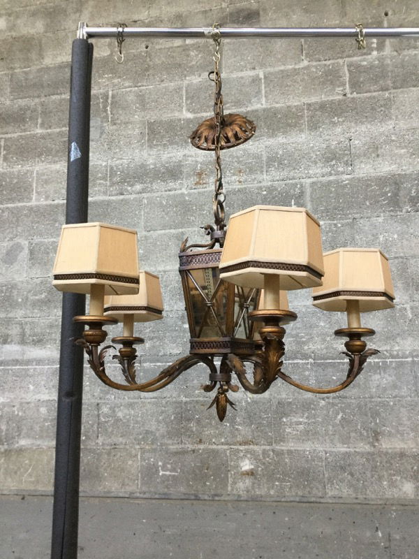 Elegant 6 light chandelier with antiqued mirrored central lantern, surrounded by 5 candle type lights with shades. Price reflects that one of the shades broke off, and the interior of said shade got ripped during its journey. Shade is available at customer service.
