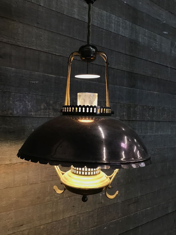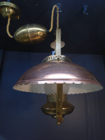 Pretty brass and copper mid century pull down light with glass hurricane shade. Some pitting on the copper shade, and we recommend rewiring; please check out our Second Use lighting services. Price reflects.