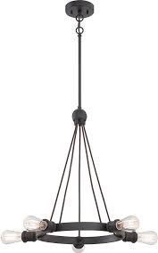 Satco 'Paxton' five light chandelier in Aged Bronze, meant to be illuminated with bare Edison style bulbs.