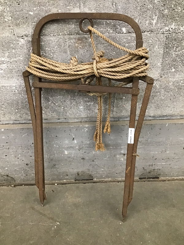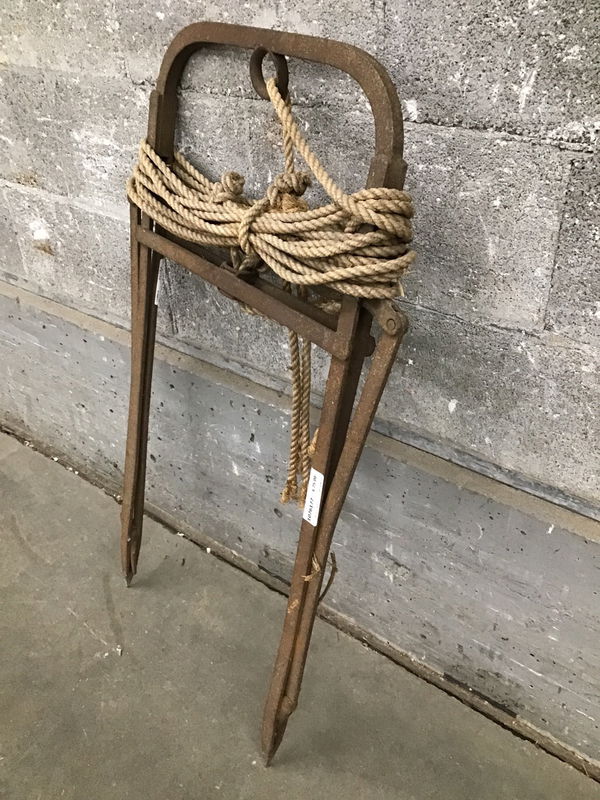 Antique hay claw that was used with a cantilever pulley system at the top of a barn and pulled by horses to raise hay from below to the loft section of a barn. This tool predates hay bales. With some imagination and skills this could become an awesome light fixture!