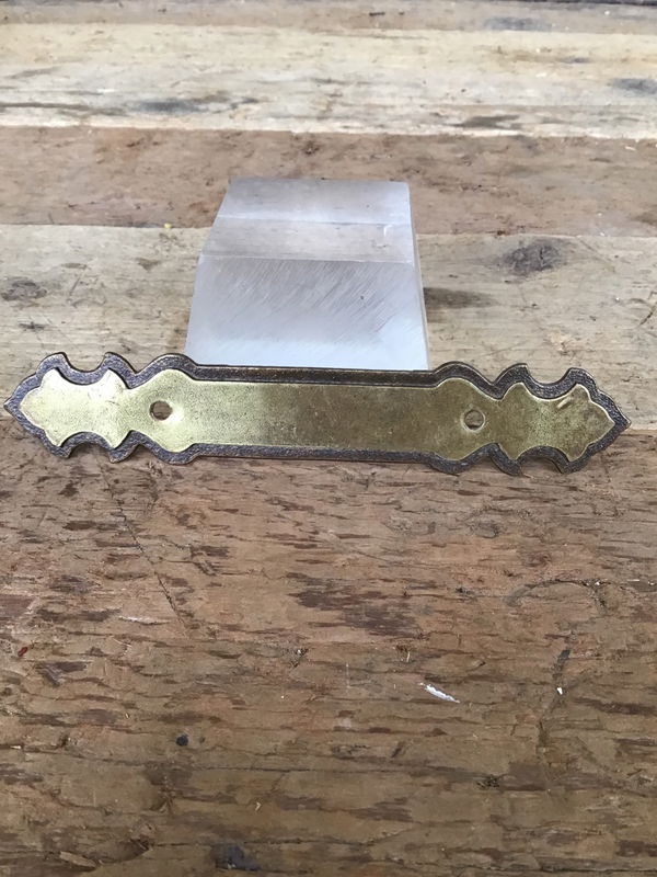 Set of ten brass cabinet pull backplates with a fancy design and an antiqued finish. They appear to have never been installed.