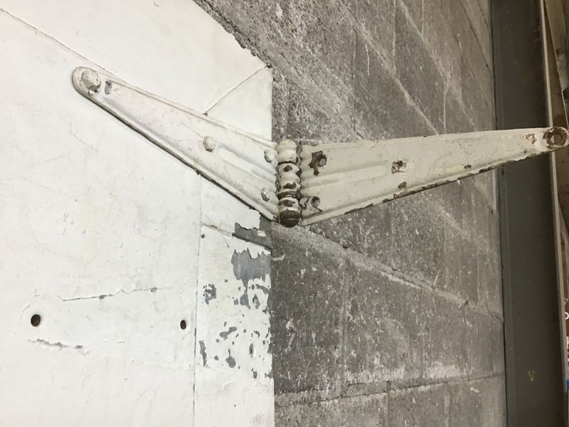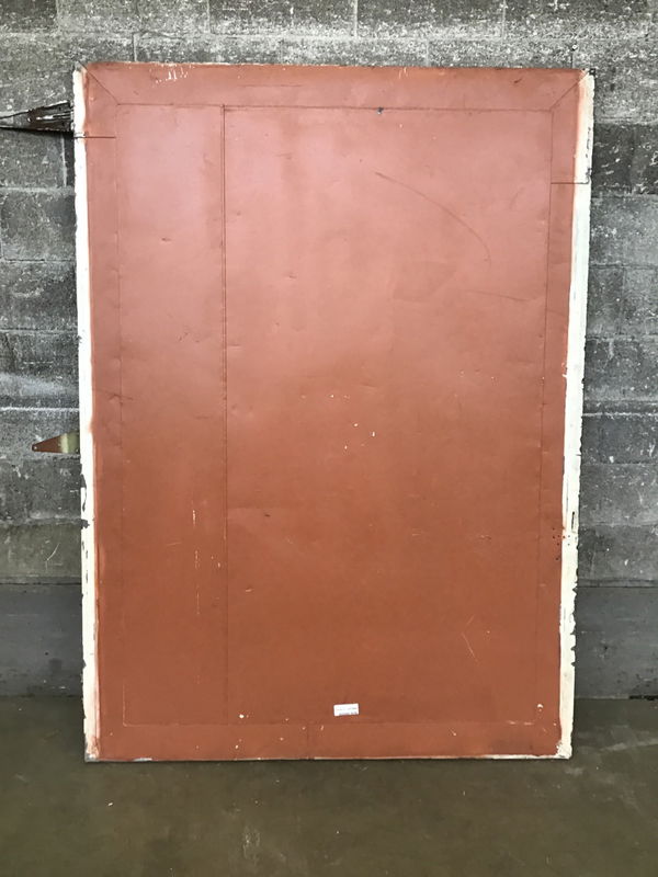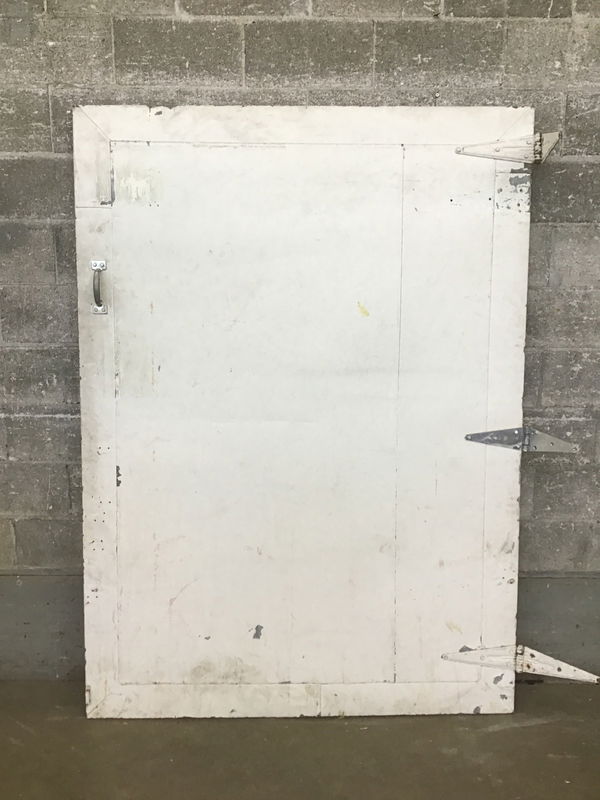 Vintage warehouse or commercial building fire door that's been clad with a tin skin or wood. We left the three strap hinges attached. Not sure if it was intended to swing left or right