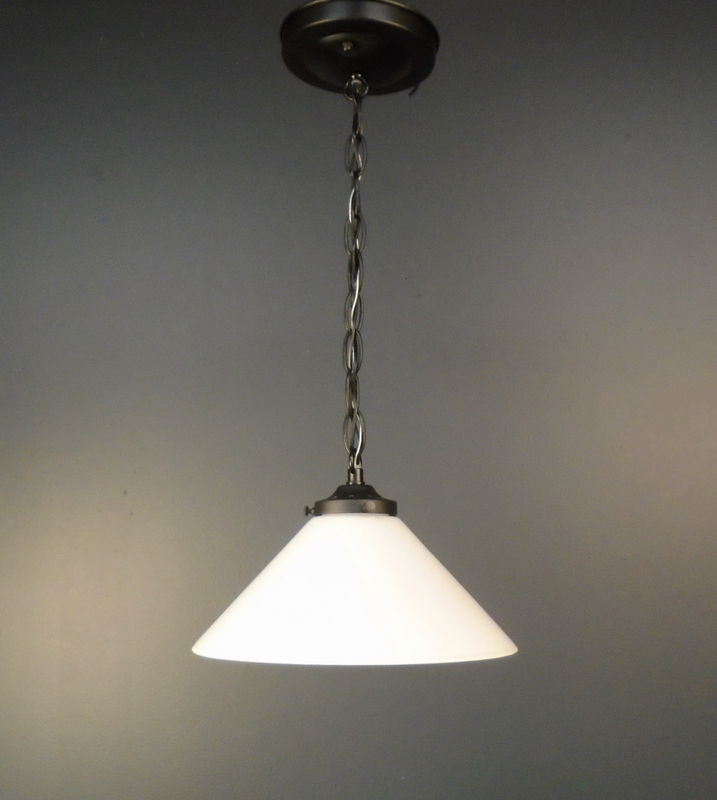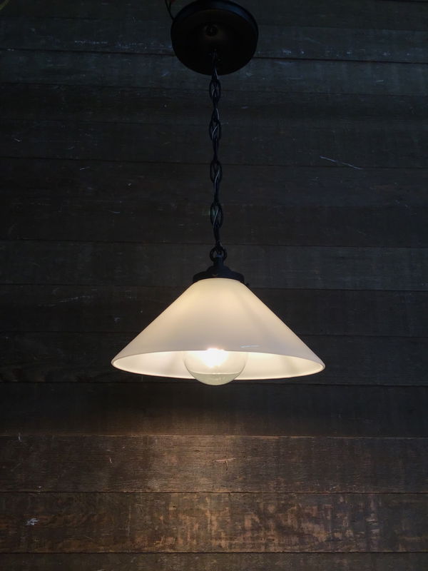 A vintage white hand blown shade hangs on a matte black chain drop pendant base that was built in our on site light repair workshop