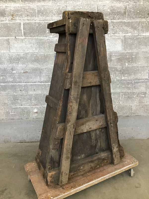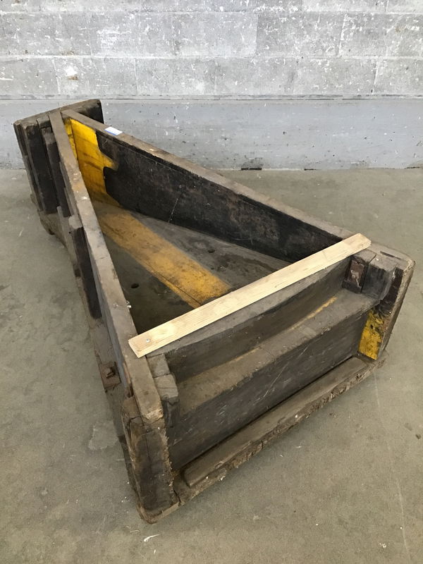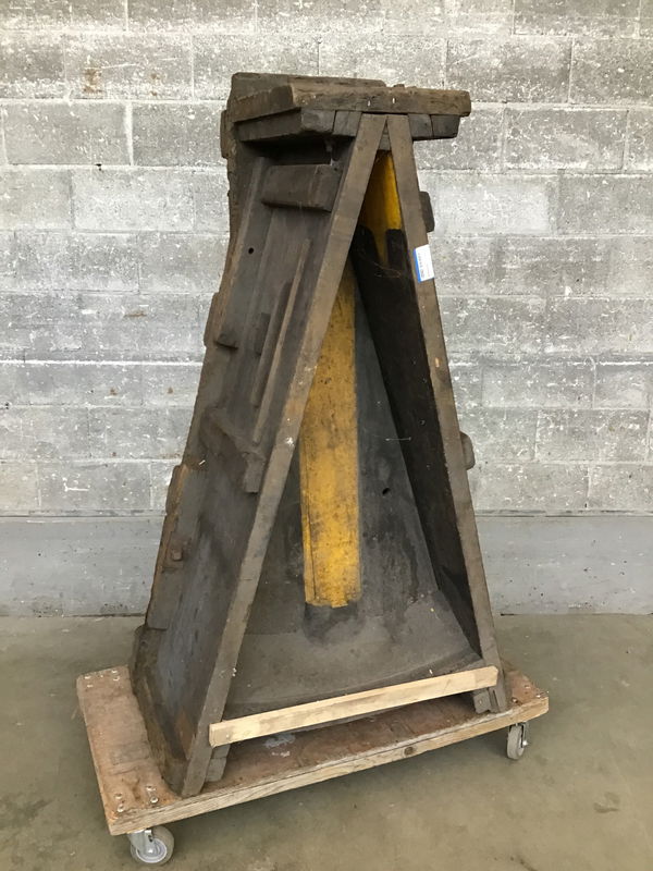 Awesome and substantial foundry pattern that looks vaguely like an A with a carved out center and slatted sides. If you were to clean this up and add a glass top it would make a really fantastic coffee table. I could also see it being repurposed as a pretty epic bookshelf with some creative effort. Width given is for the wider edge, the narrower measures 15.25".