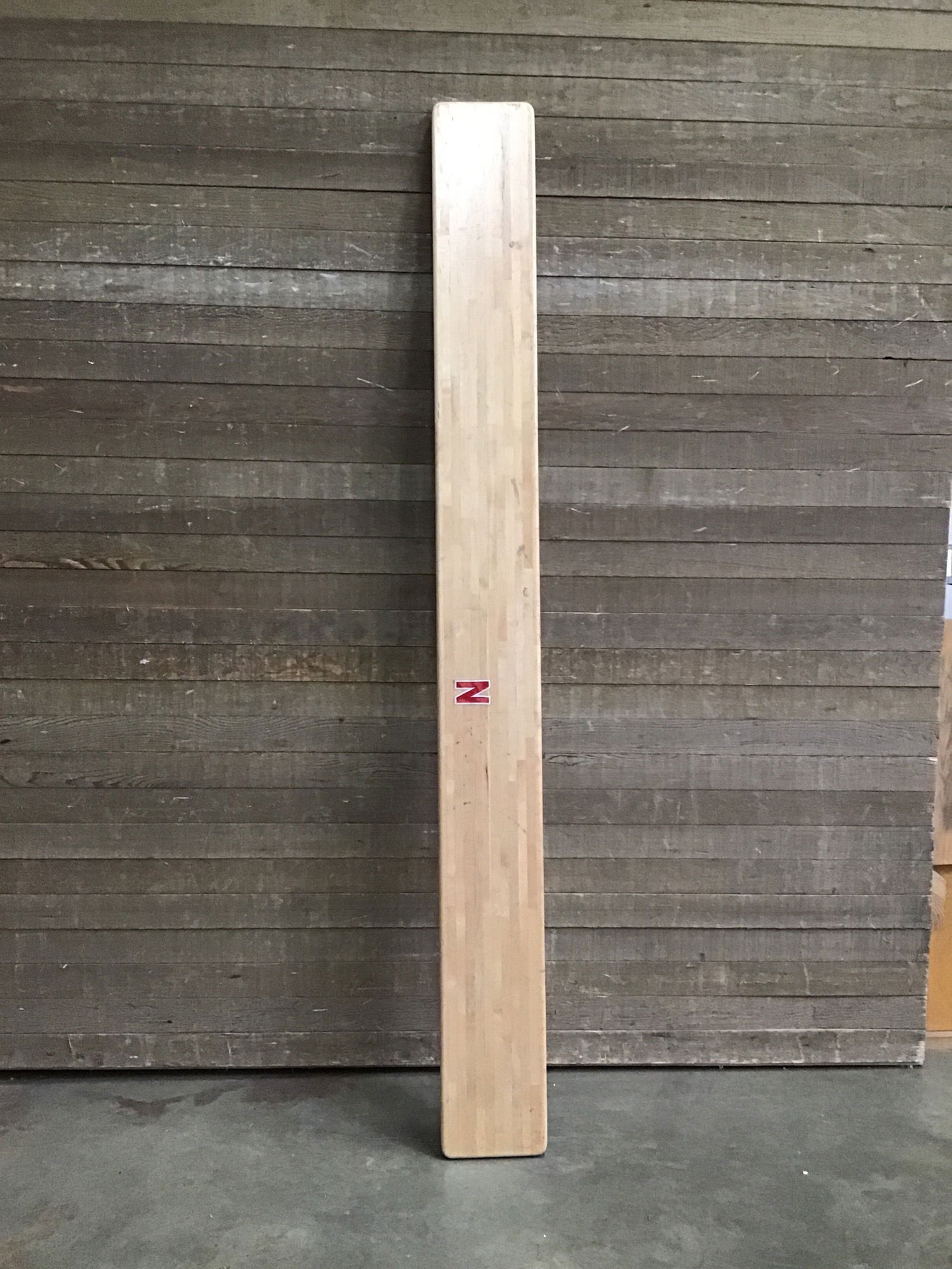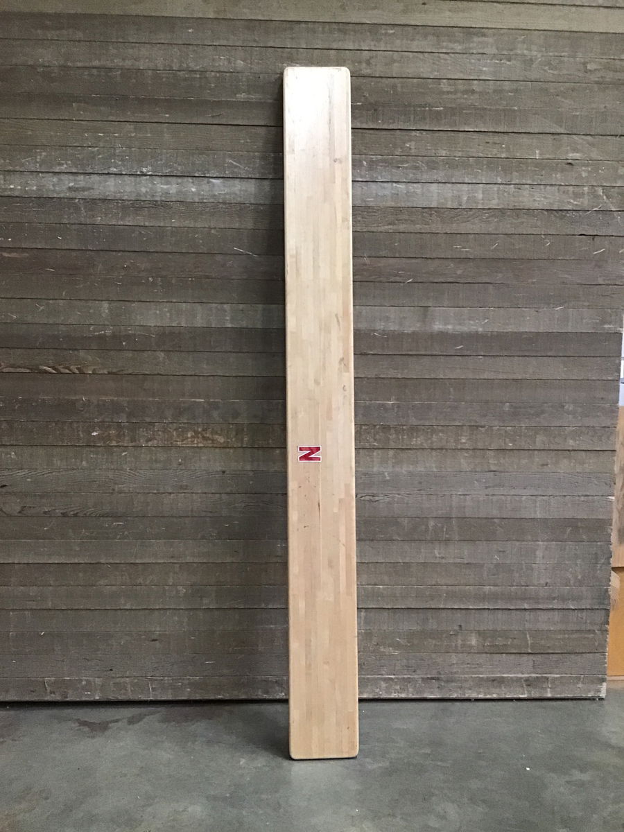 Clear finished, joined maple locker room bench seat. Shows signs of authentic locker room use--scratches scuffs and maybe a little graffiti. Photo may be representational.
