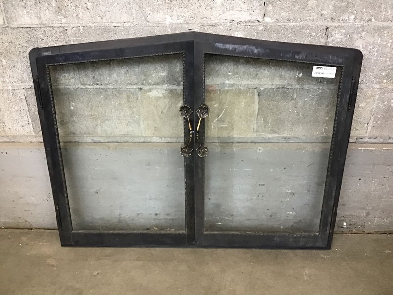 Gorgeous solid brass fireplace doors with a dark and moody finish that came to us from a 1913 Capitol Hill mansion. The glass is adorned with a dotted border and the doors open with 2 ornate gingko leaf-esque pulls. The hinges also have sweet little finials.