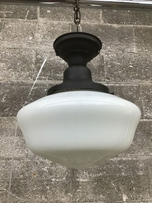Ca. 2011 Rejuvenation school house style light with a milk glass shade mounted on a black finished fitter. Dimensions are approximate.
