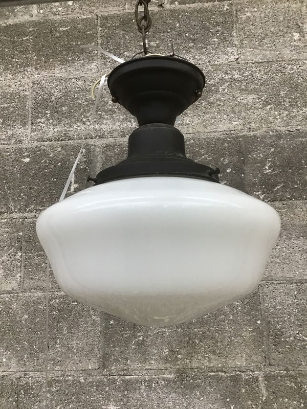 Ca. 2011 Rejuvenation school house style light with a milk glass shade mounted on a black finished fitter. Dimensions are approximate.