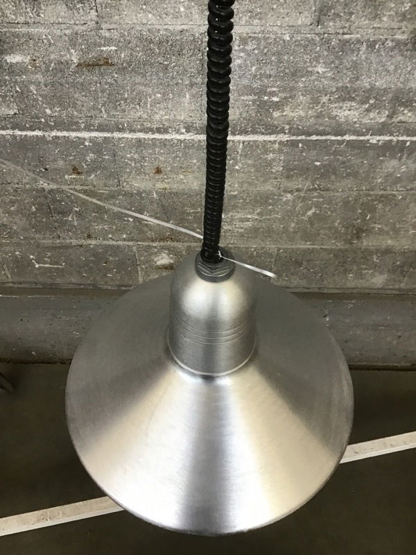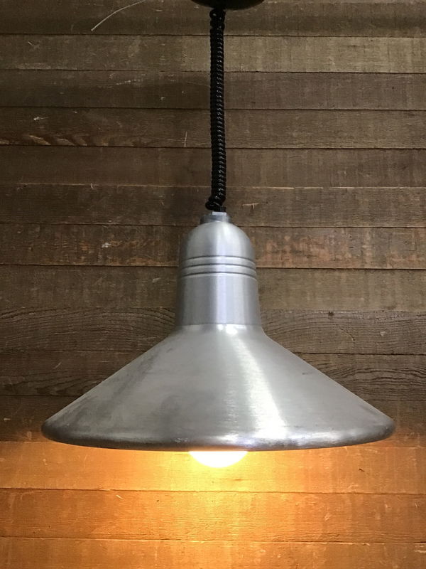 This vintage saucer pendant light feels like an awesome crossover between mid-century and industrial. It's constructed of a pretty heavy gauge aluminum (brushed exterior, polished interior) with a hazy glass shade covering the single bulb. The shade hangs from a coiled black cord and has some subtle decorative lines on the top. Because the aluminum is a little heartier this is not dented to heck and instead just has a handful of really miniscule dents and light scratches. We got quite a few of these in, so come check them out and grab your favorites to illuminate your shop, home, garage, retail space, or any space at all! Photo may be representational. Cord is included in the listed height.