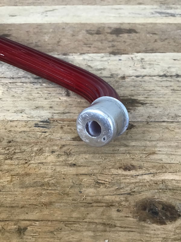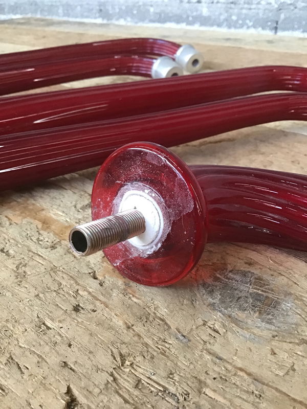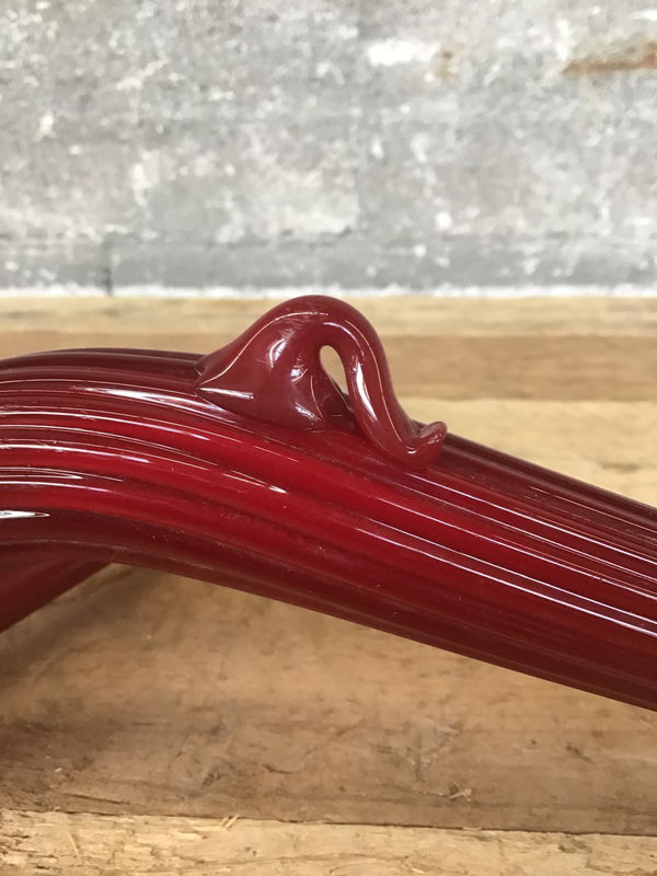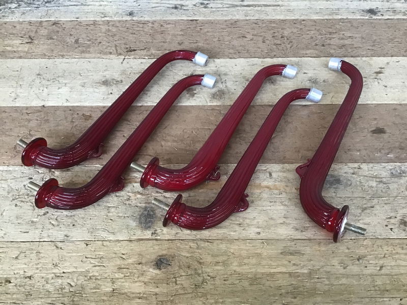 Recovered from a broken chandelier, this set includes 5 chandelier arms, each featuring red glass construction, an arced form, a metal fitting and a threaded end. These could be fun for a custom chandelier project. Given their handmade quality, dimensions vary slightly between pieces.