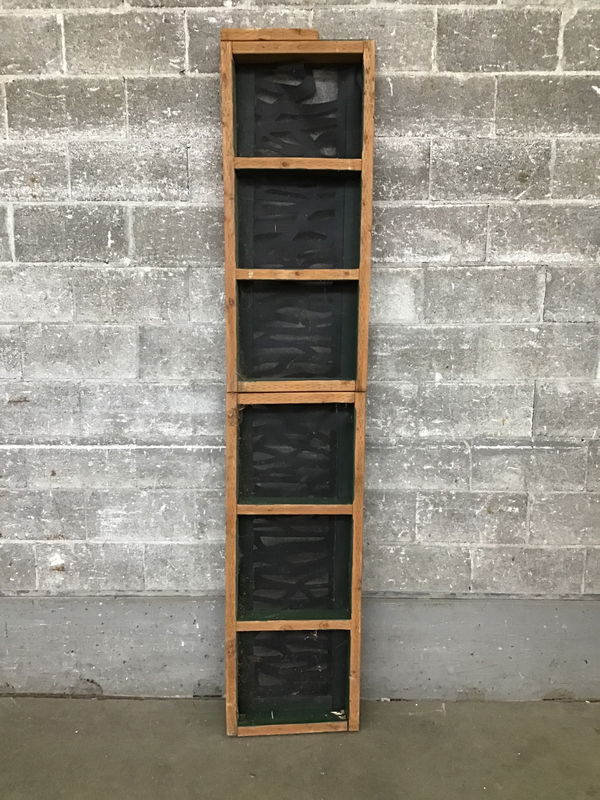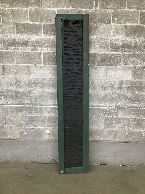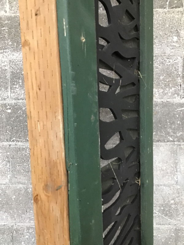 Framed exterior screen constructed of treated 2"x4"s and other pieces of wood, painted green. Includes a black plastic cover over the screen with a zebra-esque pattern cut out. Would work well under a porch to keep out the riff raff. Screen has a little damage in one corner. Price reflects.