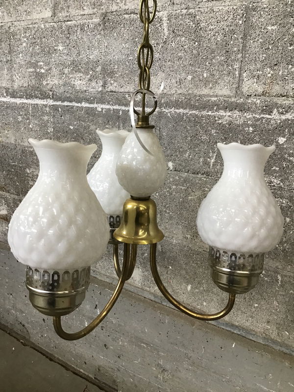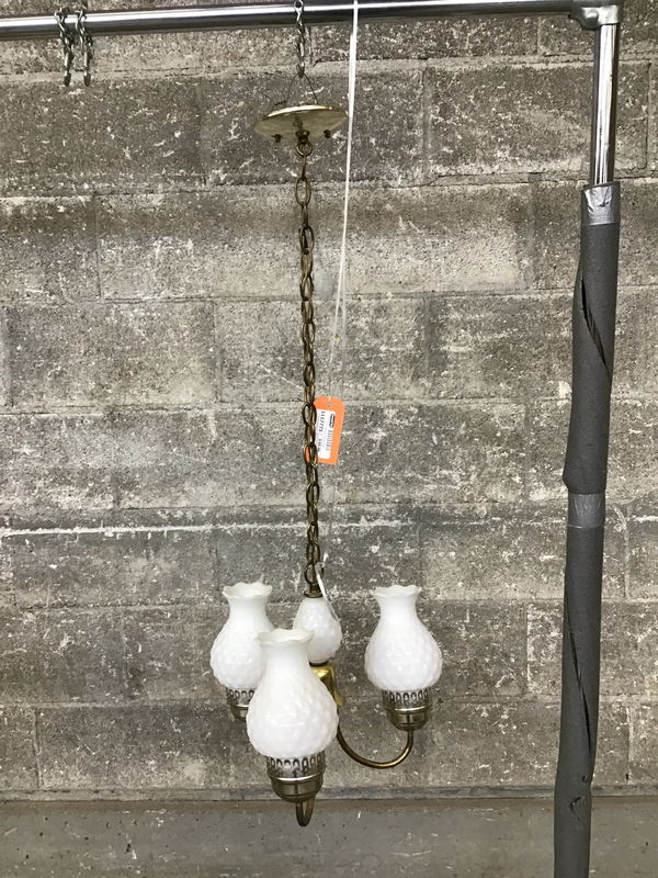 Three bulb pendant light, or small chandelier, with hobnail like, white pillow glass shades & spacer. If you’d like to get this light fixture rewired here at Second Use, please check out our in-house Lighting Services.