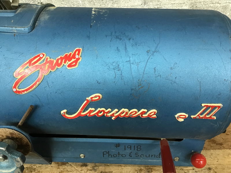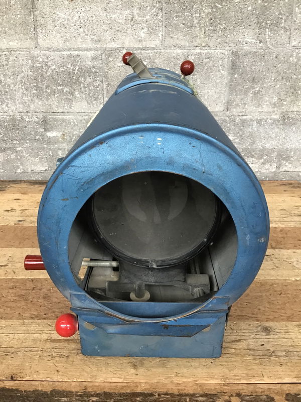 From Strong International, this vintage Trouperette spotlight features a steel body, a bulb, various shades and a charming blue and red finish. This unit is missing its stand, and wears tape residue and permanent marker from its previous life. Appeared to function when tested.