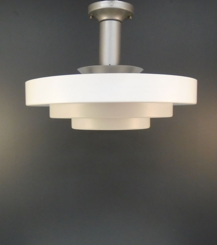 A gorgeous 1950s semi flush ceiling light with concentric "Saturn" rings made by Lightcraft of California. The design of this iconic light is credited to Kurt Versen. Has been rewired in our on site light repair workshop. May have some very minor age related blemishes. Photo is representational