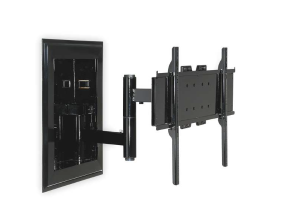 From Peerless, this black steel in-wall TV mount can accommodate a screen ranging from 32" to 65" and up to 200 lbs. in weight. It offers a max extension of 10" and can tilt up to 45º. It came to us new in the box with all of its necessary hardware as well as an installation manual. Check out full specs here.