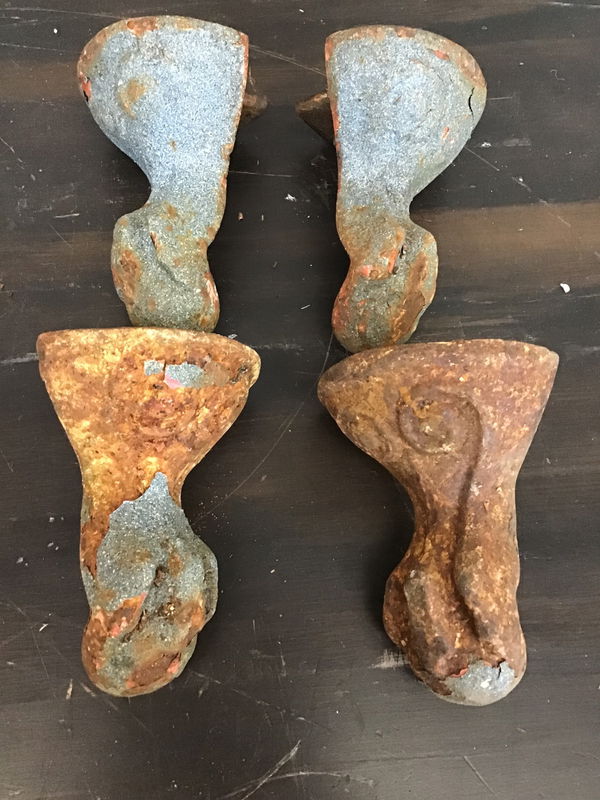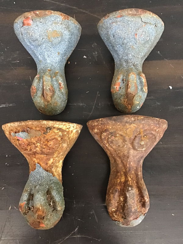 Set of four matching claw feet, ready to use with your vintage tub or repurpose for some sweet unique legs on a furniture piece. They're all heavily painted but in good structural shape, with just a bit of surface rust here and there. Includes all set screws (although one is a replacement), which mover freely.