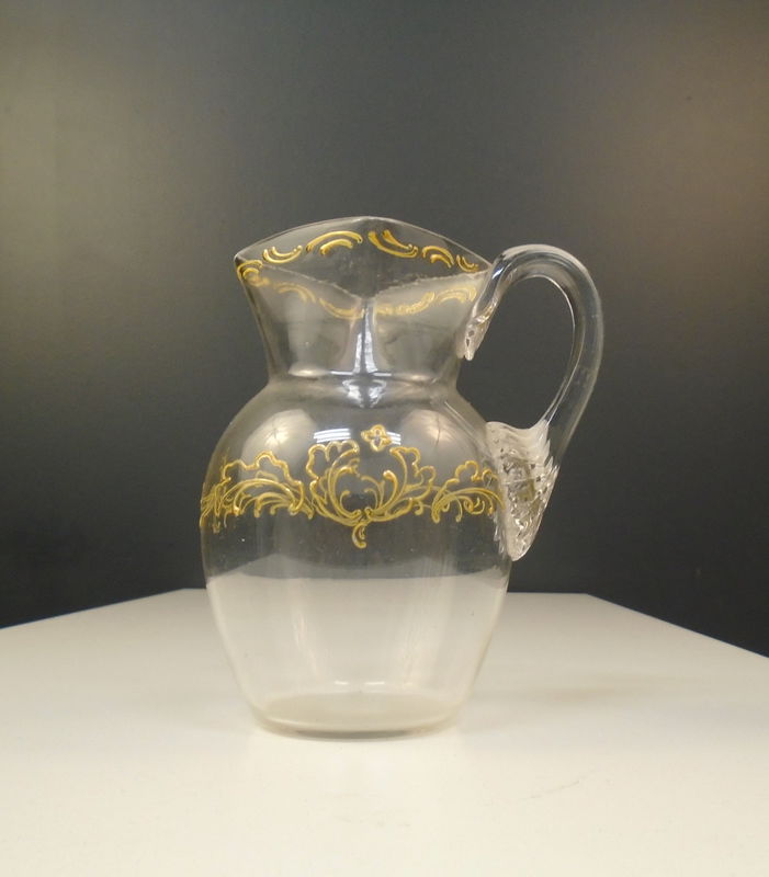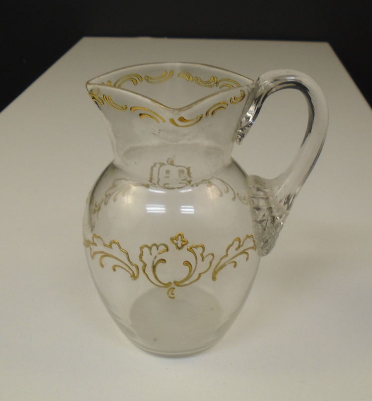 A pretty little pitcher/vase from the early part of the 20th Century/ Late 19th Century. Clear with gilt paint, and a square mouth. Very interesting and cute!