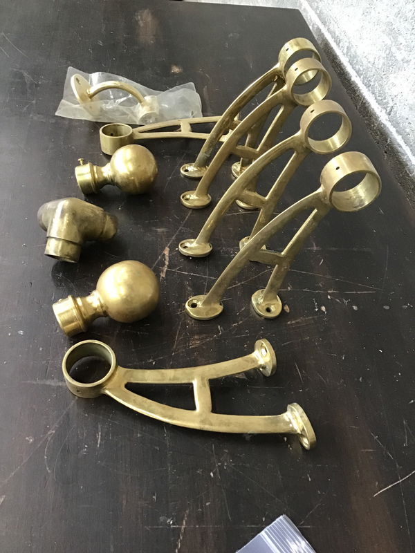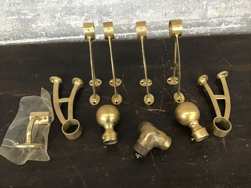 High Quality Bar Foot Rail Fittings 6ct, ball end finials 2ct ,and a three way flush side 1ct. Made of solid brass nice patina. Would be a great addition to any bar or pub.
