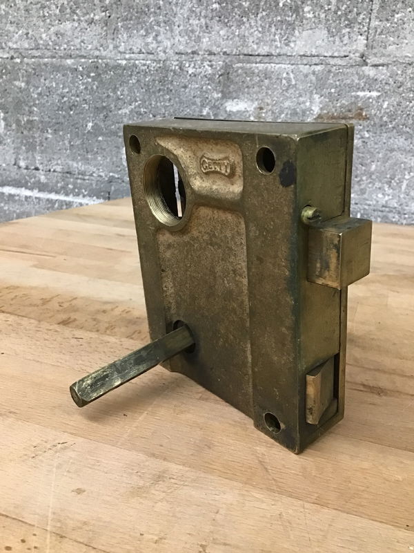 Vintage Corbin rimlock set with lock set, escutcheons and key hole, and the nearly always missing strike plate.