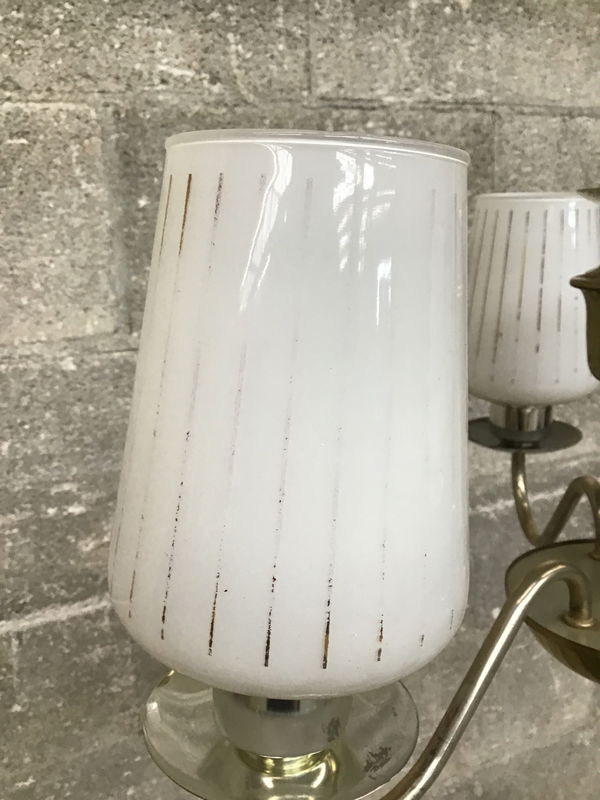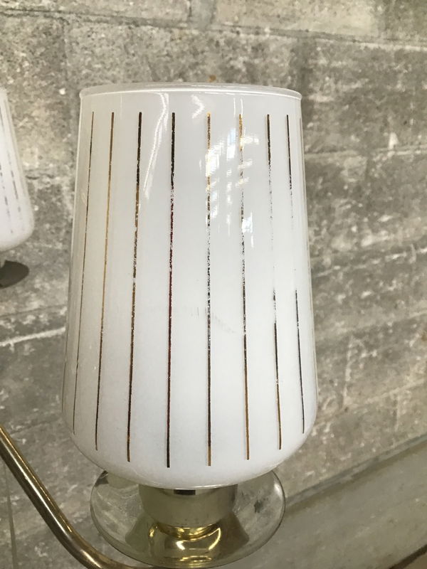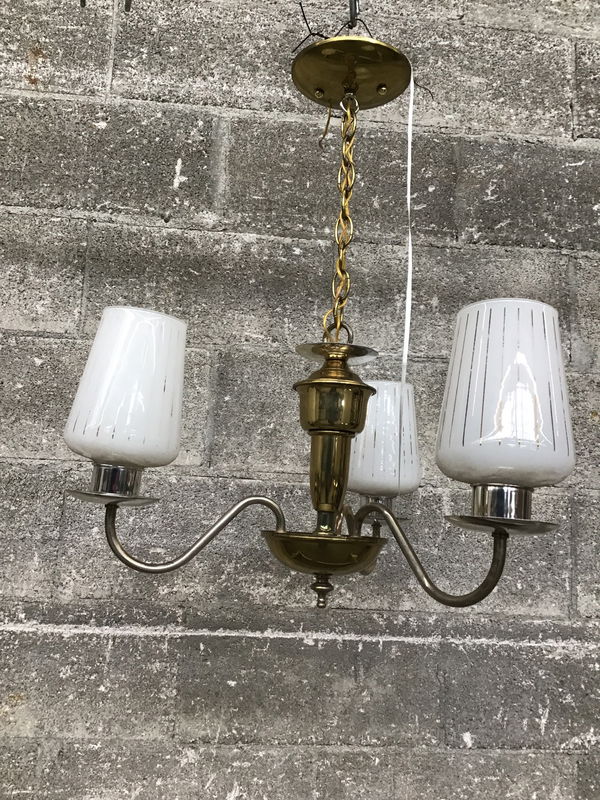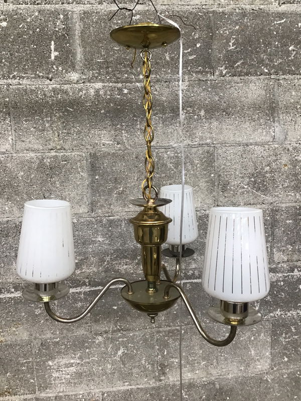 An adorable MCM 3 light chandelier in brass and chrome with three white shades adornedfaded gold stripes! So Cute! Restored in-house with new sockets and wire. Sockets are rated for 60 watt bulbs max.