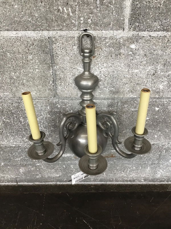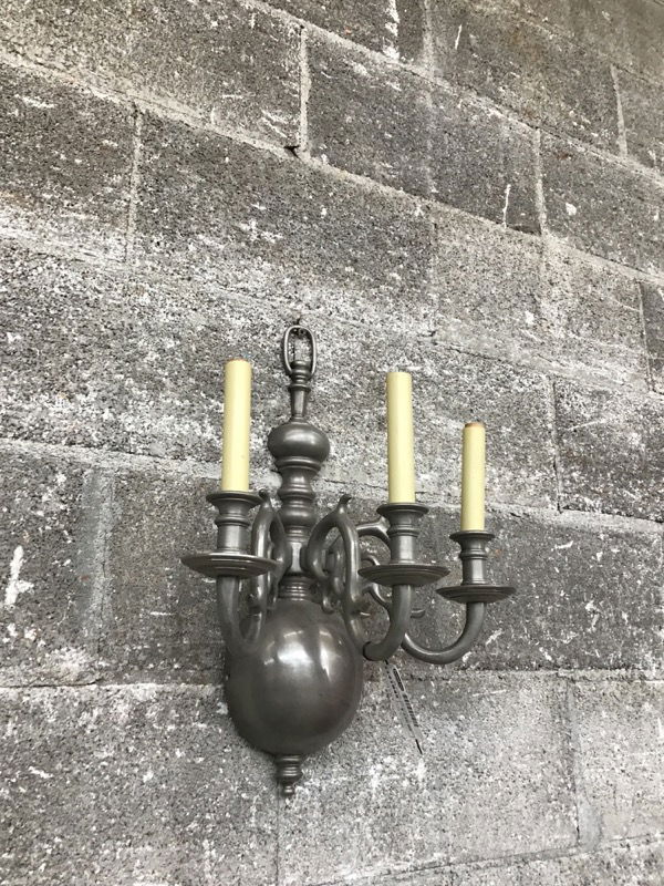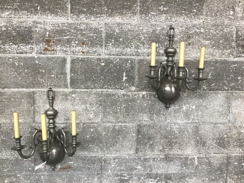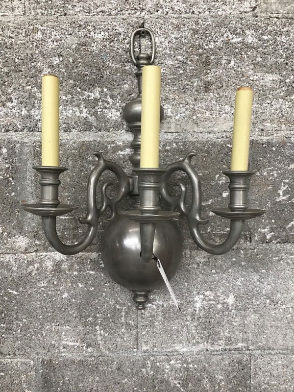This set includes two grand wall sconces, each featuring a pewter finish, three curling arms and three candlestick light sockets. Some subtle scratches and wear to candle sleeves. Dimensions are per wall light. These arrived with matching chandeliers (#1141831 & #1141837).