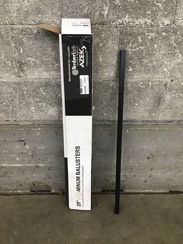 Full box (20 count) of powder coated (black) aluminum balusters made by AZEK for a deck railing system. These look to start around $100 a box and go up from there depending on where you buy them. Photo may be representational.